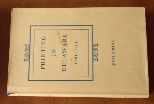 Printing in Delaware 1761 – 1800, by Eval Rink, 1969. Nice blue cloth hardcover with blue and yellow endbands and small tear to dust jacket. Not so much a narrative but a list of various printers in Delaware for the years mentioned. Let’s pick something at random. “127. Wade, Francis. Advertisement. To the inhabitants of the Delaware State [concerning horse thieves, deserters, and George Evans’ illegal sale of public flour. ..]” ah, The good men do goes with them to their graves, the illegal sale of public flour is remembered forever.