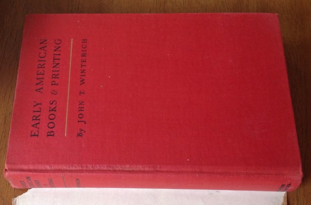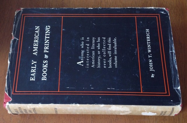 Early American Books and Printing, by Winterich, 1935. Good red cloth hardcover, damaged dust jacket. Name and date inscribed on fly leaf, otherwise clean. The author states that the work should be considered not so much as a definitive reference as a guide to sources. Would really distinguishes this work is the wonderful writing style of the author, such as this description of a group of books including five copies do the Bay Psalm book: “Prince willed his collection to Old South, and it remained in the steeple for a century, accumulating dust, prestige, and value. ”