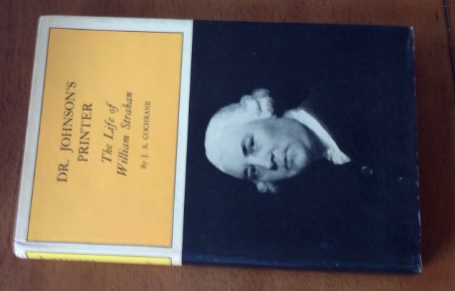Dr. Johnson’s Printer – The Life of William Strahan by J.A. Cochrane, 1964. Nice pink cloth hardcover with dust jacket, very clean. I’ll just quote the blurb: ” William Strahan was one of the leading figures in the booktrade of the 18th century. As Kings printer, a member of Parliament and the owner of the greatest printing house in London he stood at the head of his craft: in addition to his long friendship and business connection with Johnson, he was the publisher of given Adam Smith human and Robertson. His intimacy with Benjamin Franklin Led him to extend to America his lively interest in politics as well as trade… Strahan was an admirable letter writer, and his correspondence with authors, booksellers and printers touches on many problems still relevant today – the earnings of writers, best sellers and flops, price cutting and piracy, long credit and bad debts. The book is thus a portrait of the booktrade at a particularly interesting stage of its development as well as the story of a remarkable career.” It’s true – Strahan’s letters are a window onto a fascinating era.
