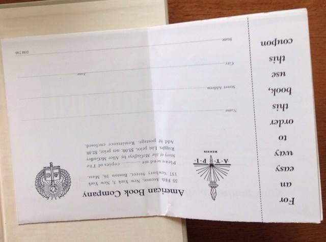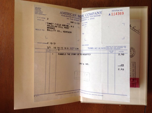 The Story of The McGuffeys, by Alice Ruggles, 1950. Tan cloth, red/yellow endbands, nice clean binding with bonus material in the back! Remember Emmett Horine from the last post? Glued in the back is the original invoice from the American Book Company with Emmett’s name spelled every which way wrong, along with a letter, which is a folded flyer? advert? order form mailed to him postmarked Cambridge, Mass with a two cent stamp, on which is handwritten “From Mrs. Ruggles”.