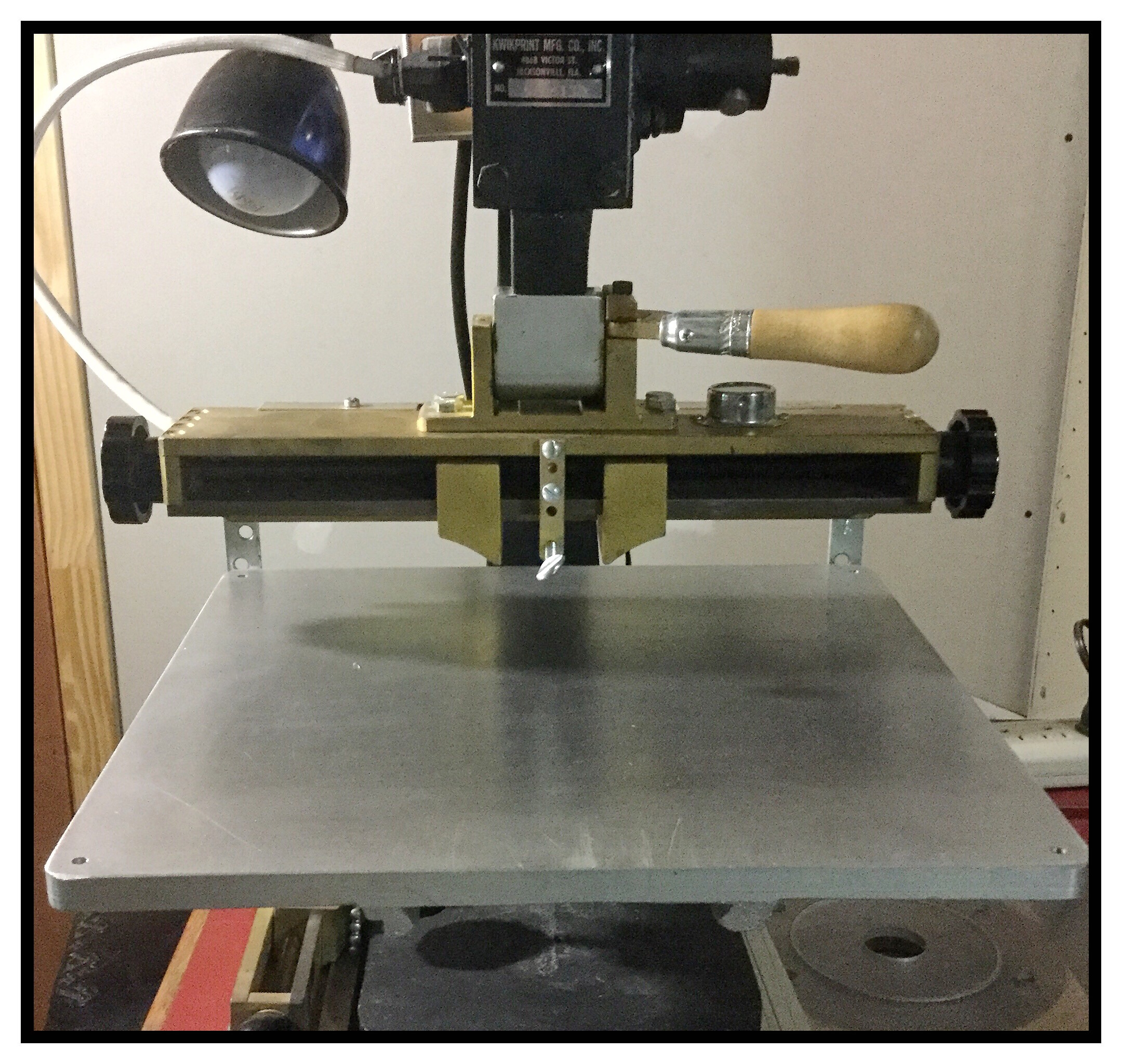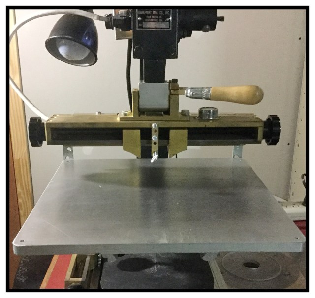 After the modifications to my Force, I had no more trouble aligning materials for stamping. Stamping multiple lines of text was still a giant headache, though. My KP has a table than can be moved forward and back to permit multi-line titles, but there is no way to easily get the proper spacing. I tried inserting spacers between the back edge of the table and the iron upright post holding the printing head. I tried using a ruler to move the table out. But the upright iron is curved and uneven, and I hated the process. For years I’ve stared at that machine wondering what to do.