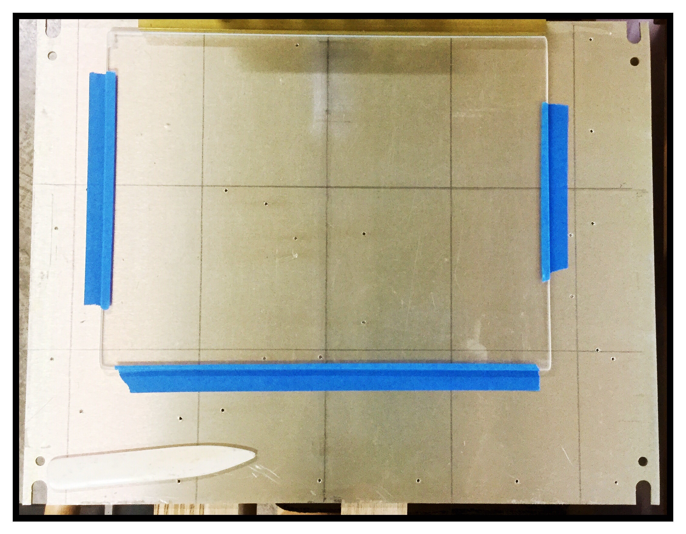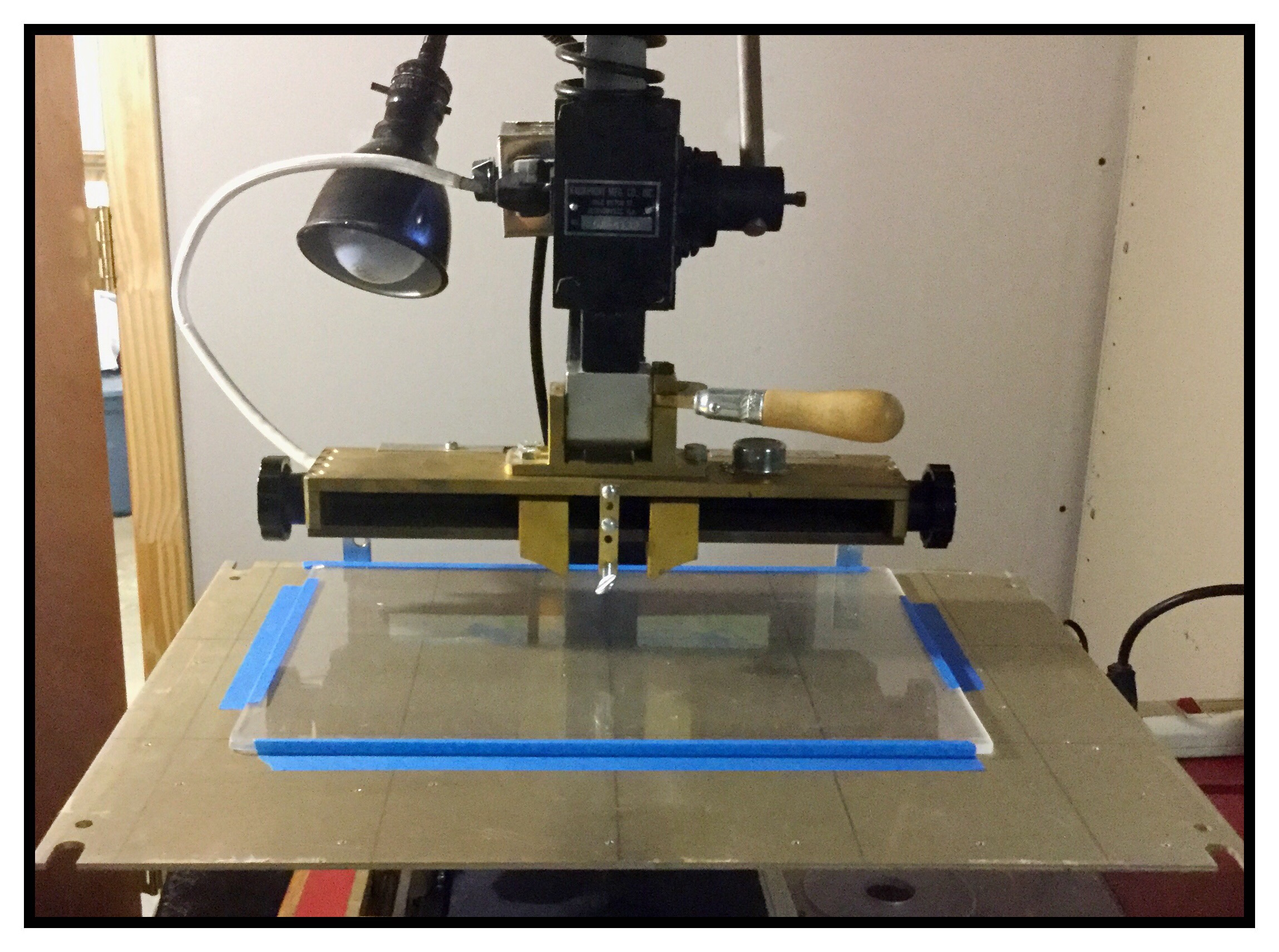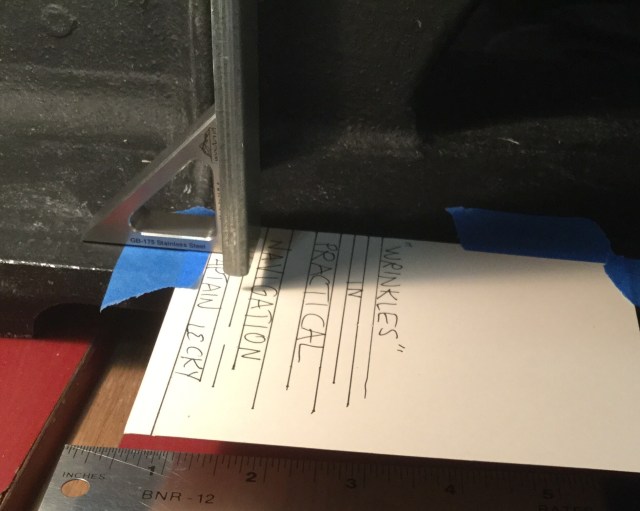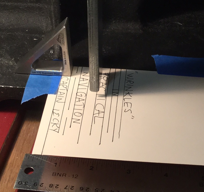 I laid out the text for a sample title using two dividers on card stock, drawing black lines at the top/base of each line of text. I affixed my blank label to the make-ready on the Force and taped everything down firmly. I placed my cartoon on the base, parallel to the table, and taped it down as well. I took a small Bridge City triangle and lined it up at the base of the first line, dialed the table back until I heard the tiniest click, the locked the table in place. This caused the table to rack slightly, so I adjusted it until it was right.