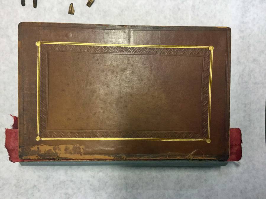 Back of book, showing repair attached. Notice how the repair leather is pasted on TOP of the original boards, and only goes part way down. That’s probably because at the time that repair was made, part of the original spine was still attached. And normally the repair leather would have been put UNDER the cover leather, not on top of it.