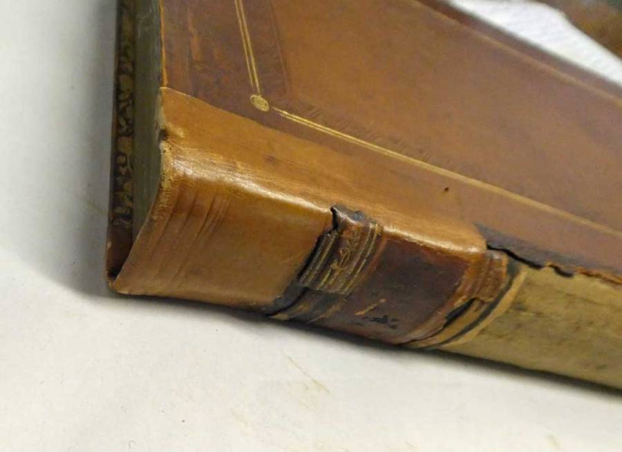 Corner shows some wear and loss of leather. Looks as if the finisher didn’t miter the corners, but just ran the roll off the end.