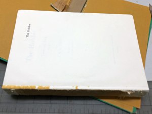 Next I removed the old cover, keeping it handy to protect the text block during rebinding.