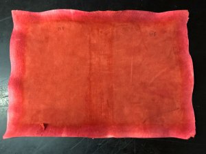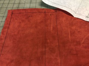 Then I made the final decisions about leather and endpapers. Made flexi-fold endpapers. A typical book has a “stiff leaf” – the colored endsheet is pasted to the first white sheet. When this page is turned, it tends to lift the next white endsheet with it. A “flexi-fold” endsheet has the colored sheet pasted to the first white endsheet just along the outside edge, which makes the page much more flexible. It shouldn’t lift the next page when turned.