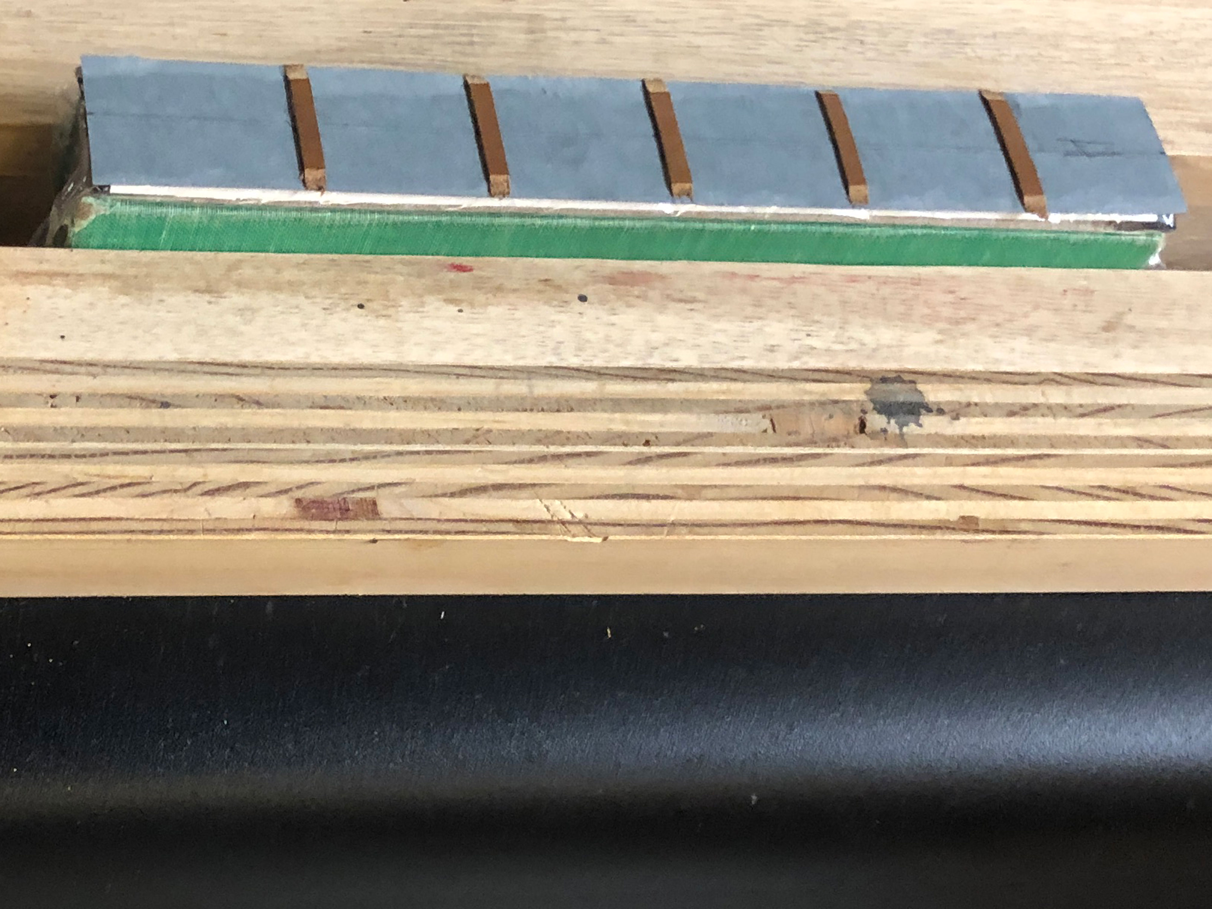 Assembled all the materials for the cover: leather, spine strip, and new cover boards. I didn’t take pictures of the tedious chamfering of the boards of lining them with paper on both sides.