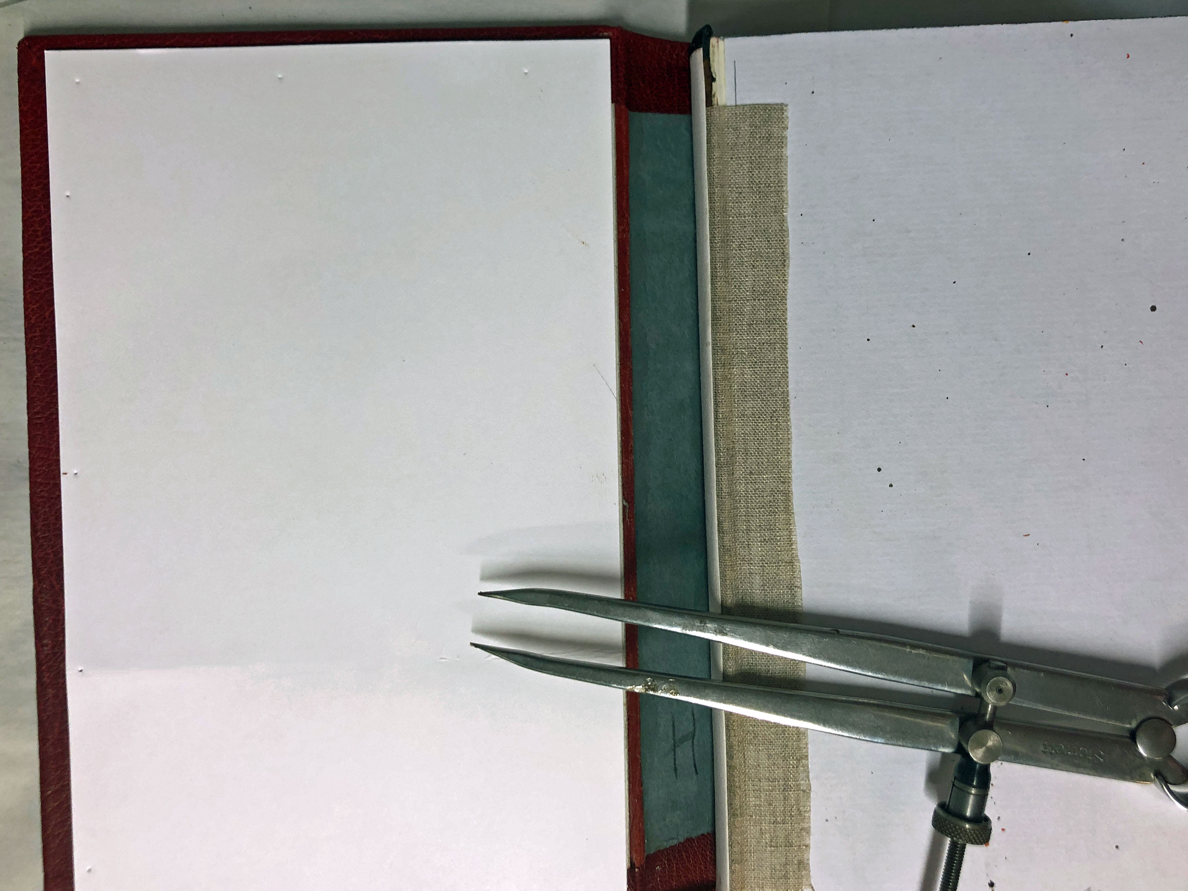 Once everything is dried, I attached the new cover to the book, gluing the spine to the hollow and attaching the linen strips to the inside covers. I trimmed them back close to the inside edges of the covers so they wouldn’t make a big lump under the pastedowns. Once that was all dry I pasted down the inside pastedowns, trimmed the new endsheets as needed, and finished the flexi-fold endsheets.