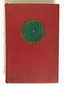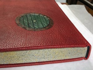 I thought a long time about decorating the cover, but none of my efforts were satisfactory. I had printed the spine text using genuine gold foil on the Kwik-Print before attaching the cover. Finally I made an inlay to look like the door at Bag End. I used a bone folder to create boards and wood grain on green leather, then set that into a piece of fair calf, then applied very thin bits of brown leather on top of that for the brickwork/stonework that surrounds the door. Colored the leather to bring out the “woodgrain” and to give the stones some shading, then inlaid that into the cover. Ask me if it’s nerve-wracking to cut a big hole in a perfectly good leather cover. OK, since you asked … it is.