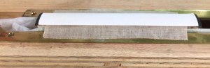 After pasting the leather to the new cover boards and forming it around the raised bands on the spine strip, I let the cover dry on the (plastic-wrapped) text block so that it would have the correct shape. Once it was fully dry, I marked the inside turn-ins and filler card using dividers to make small marks. Cutting through paper and leather at the same time gives an exact fit for the liner card. The liner card is the same thickness as the leather turn-in, so it makes a smooth surface for the decorative paper.